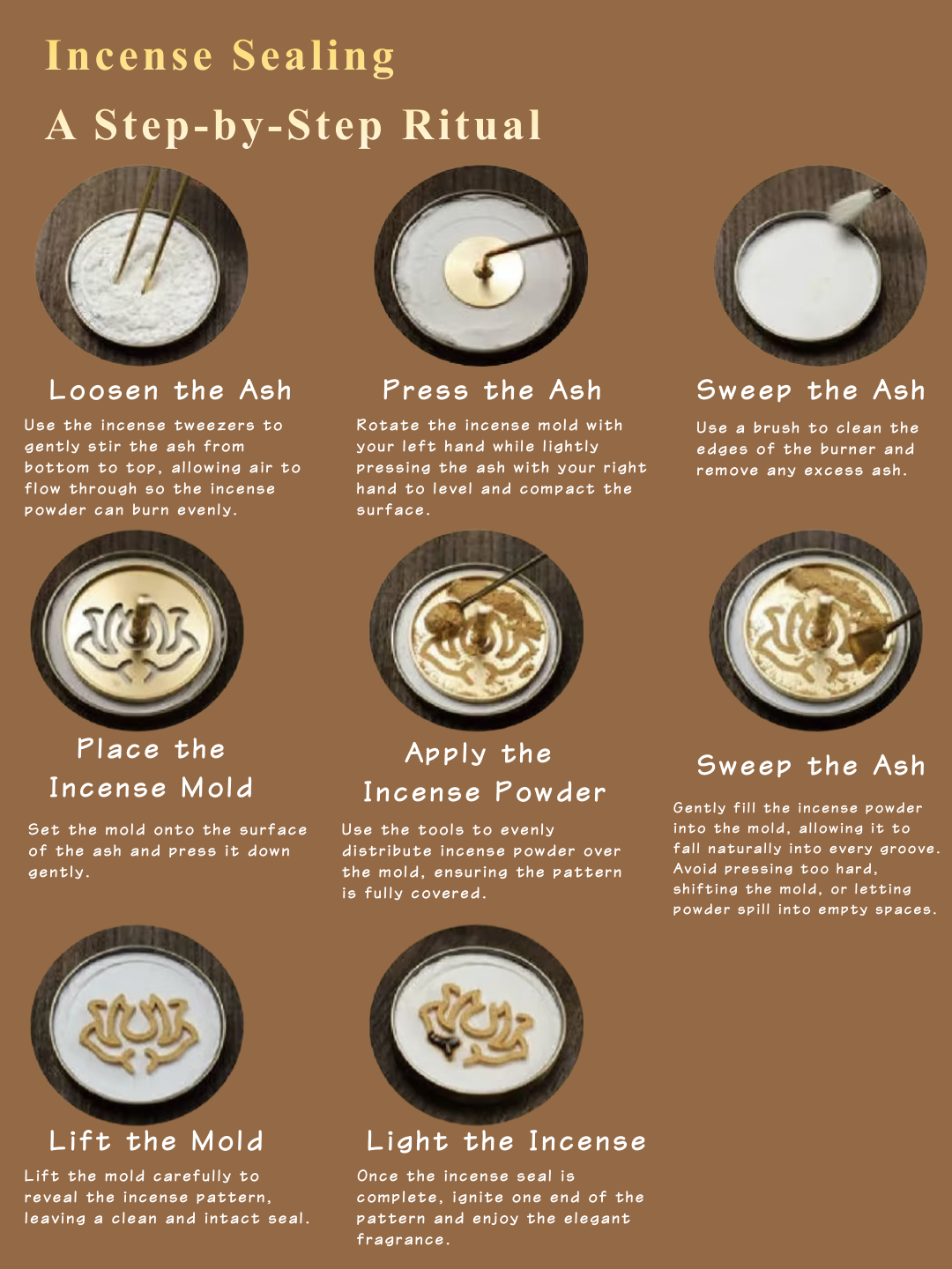 • Full 10-piece incense ritual toolkit – all tools included for incense tracing, sealing, scooping, smoothing, brushing, and lighting
